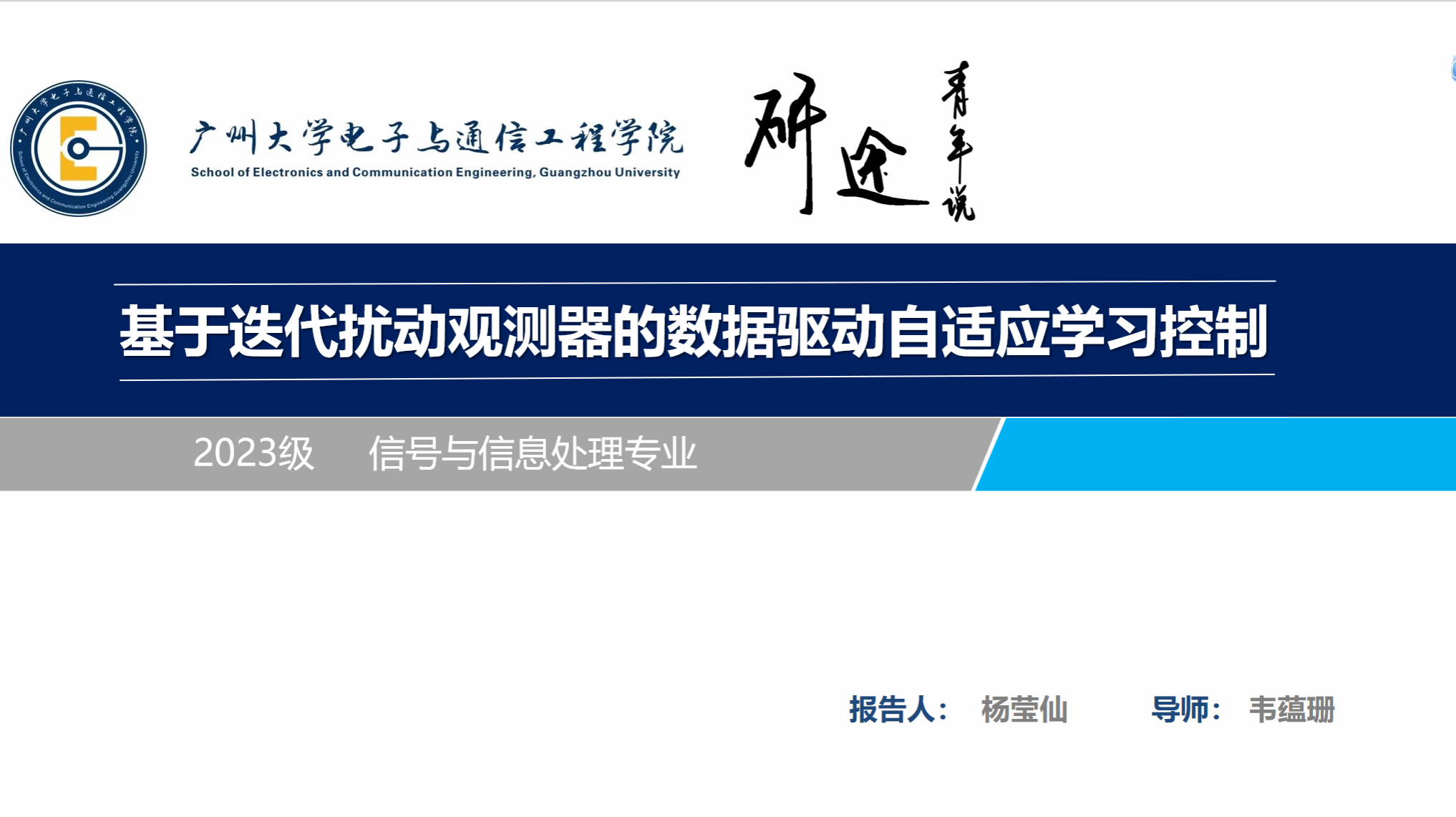 杨莹仙同学汇报的主题是基于迭代扰动观测器的数据驱动自适应学习控制,他的讲解主要包含以下6个部分:选题背景及意义、现状与研究目标、本文方案、研究方法及过程、研究结果与应用、论文总结。针对复杂工程环境下,外部干扰与重置误差等“非重复性不确定性”导致传统ILC失效,以及传统观测器(ESO)固定增益难以平衡速度与精度的问题 ,杨莹仙提出了以下核心方案:设计迭代扰动观测器(IDO):该观测器沿迭代轴运行,引入增益自适应更新算法,利用历史迭代信息实现对复杂未知扰动的精准估计与主动补偿 。提出IDO-DDILC算法:将IDO引入数据驱动控制律,有效减轻了伪偏导数(PPD)的参数估计负担,从根本上防止了参数漂移问题 。提出IDO-FFDDILC算法:针对非线性非仿射系统,引入可变线性化长度机制,在增强系统动态捕捉能力的同时,成功平衡了计算复杂度 。理论分析与仿真结果证明,该系列算法无需系统精确模型,仅依赖输入输出数据,即可在强干扰环境下实现高精度的轨迹追踪 。
