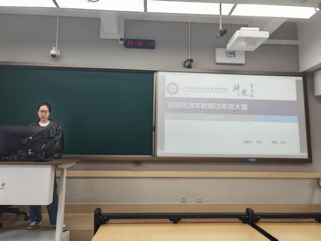 陶婧同学汇报的主题是双频高效率射频功率放大器,她的讲解主要包含以下5个部分:选题背景及意义、现状与研究目标、研究方法及过程、研究结果与应用、总结。研究针对现代无线通信系统调制信号的高峰均比特点及多种无线通信标准共存的特点,融合双频匹配技术和效率提升技术,设计应用于现代无线通信系统的具备双频高效率特点的功率放大器。研究主要包括:1)设计双频阻抗匹配电路同时兼顾双频谐波控制,以实现功率放大器的双频带工作同时提升工作效率;2)将双频匹配技术与异相功率放大器相结合,实现具备双频工作频率的异相功率放大器