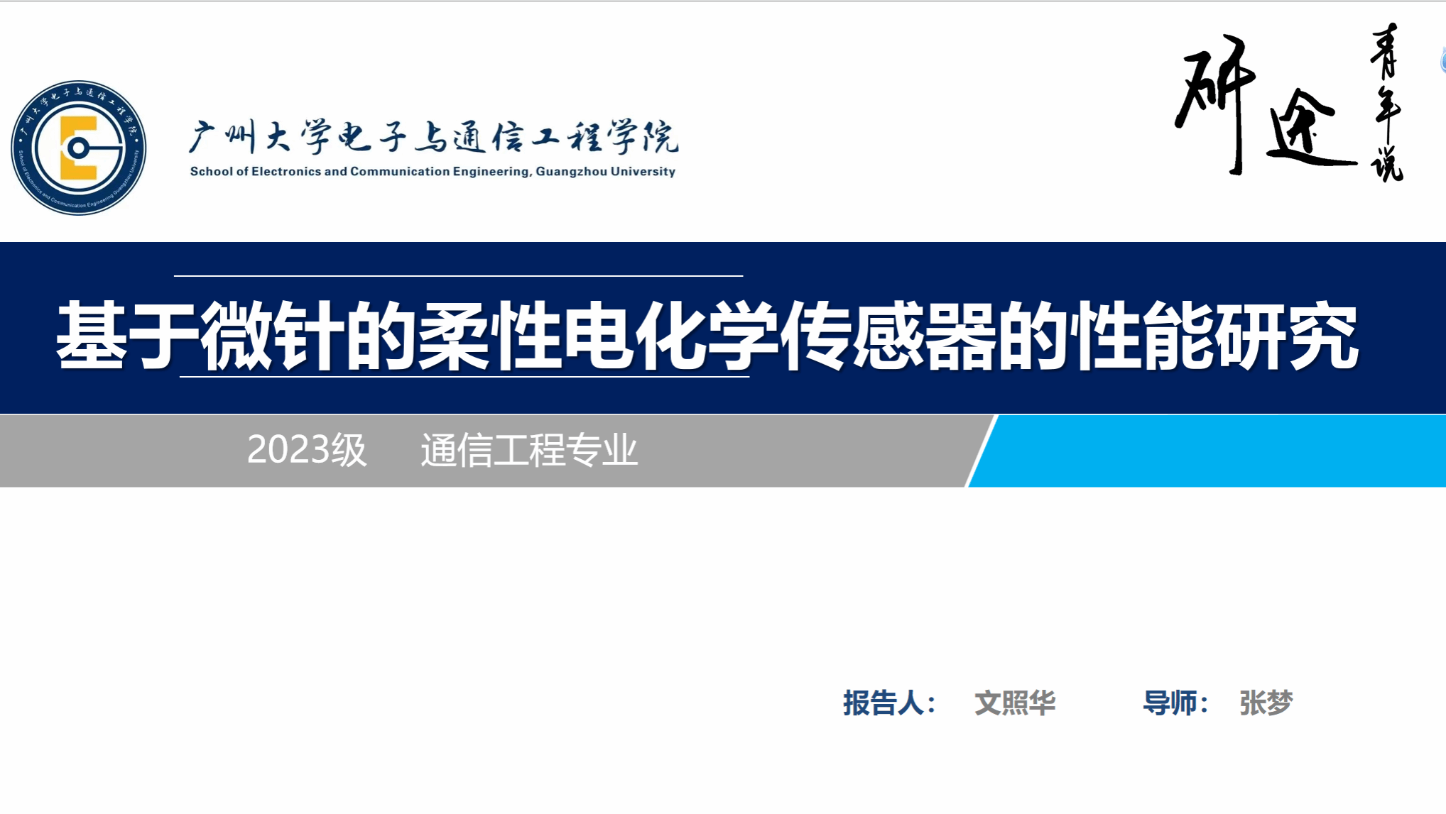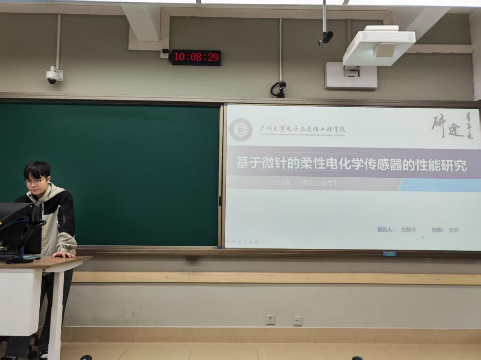 文照华同学汇报的主题是基于微针的柔性电化学传感器的性能研究,他的讲解主要包含以下6个部分:选题背景及意义、国内外研究现状、课堂主要内容及研究方法、关键技术与实践难点、研究结果与应用、论文总结。报告围绕基于微针的柔性电化学传感器性能研究展开,针对传统有创检测依从性差、无创检测精度不足的痛点,开发间质液提取 - 多参数传感集成系统。报告先阐述了柔性电化学传感器在医疗健康领域的应用前景与现有技术瓶颈,梳理了血糖监测传感器的发展历程;核心研究完成了 PLA、PCL 及复合体系微针的制备,开发了葡萄糖、pH、K+、Na + 等多参数柔性电化学传感器并完成性能优化,最终搭建了微针 - 传感一体化集成系统,为糖尿病及并发症的无创实时监测提供了可行方案。